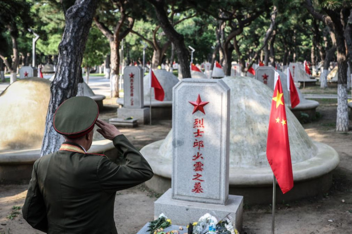 9月10日,抗美援朝老战士向烈士墓敬礼。新华社记者潘昱龙摄