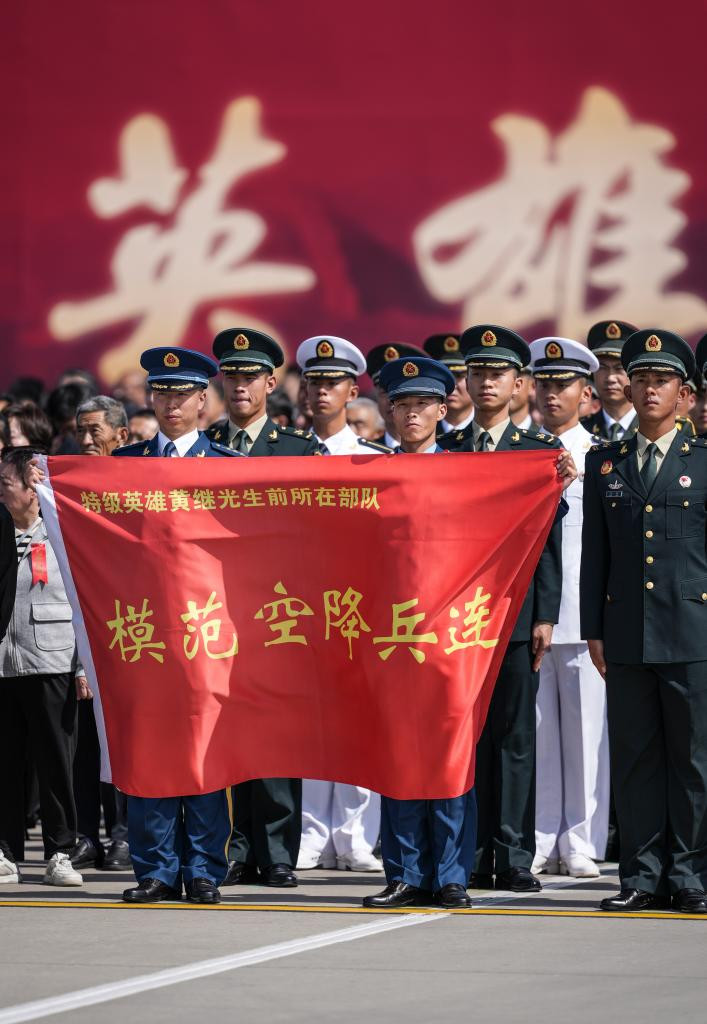 9月12日,第十二批在韩中国人民志愿军烈士遗骸回国。这是空军空降兵某部“黄继光英雄连”官兵在沈阳桃仙国际机场举行的迎回仪式上。新华社记者潘昱龙摄