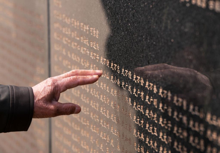 2024年4月3日,在沈阳抗美援朝烈士陵园,史荣升老人手指轻触刻有父亲名字的烈士英名墙。新华社记者李钢摄