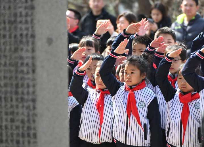 2024年4月2日,在沈阳抗美援朝烈士陵园,少先队员在沈阳市团市委主办的清明祭英烈主题队日活动上,向烈士墓敬礼。新华社记者杨青摄